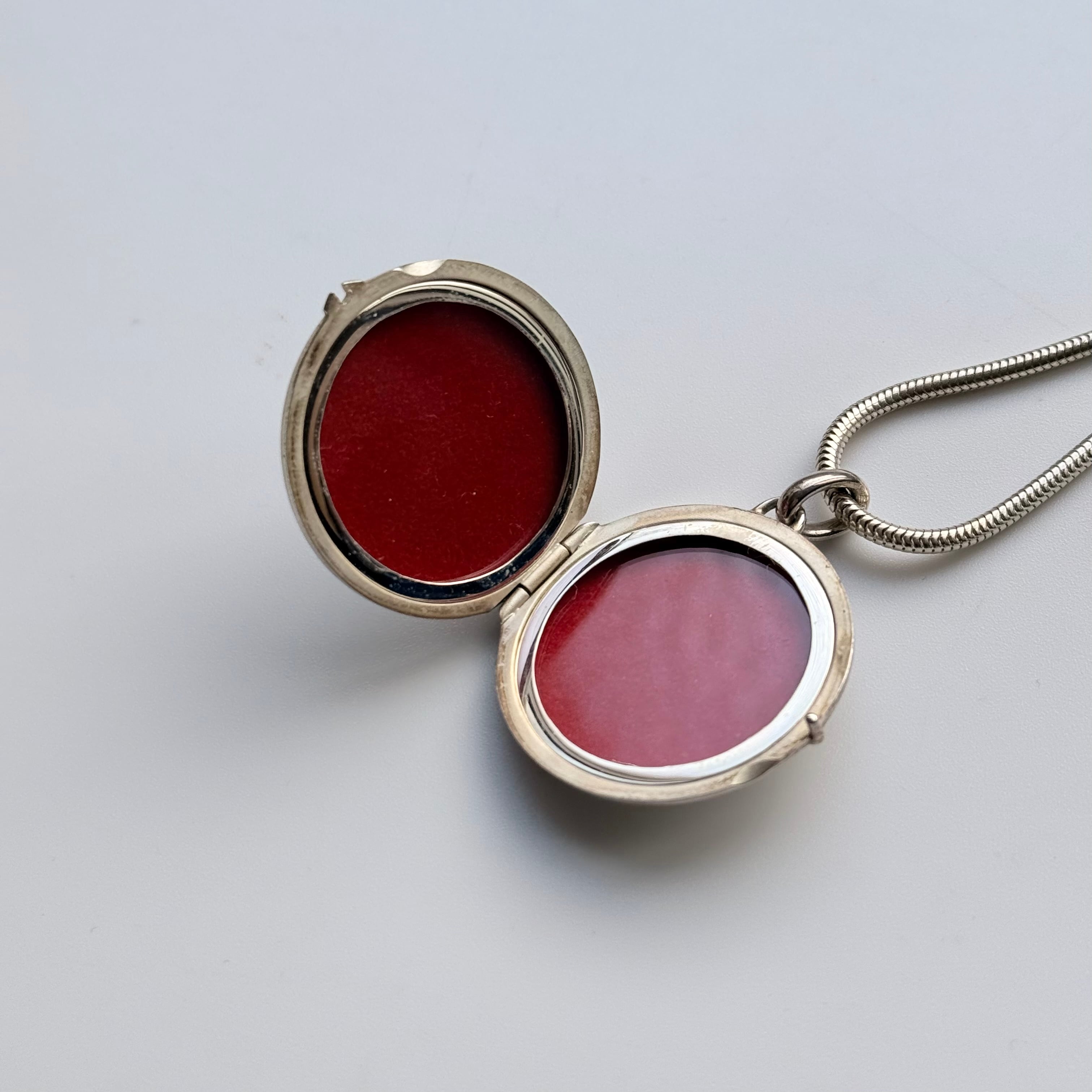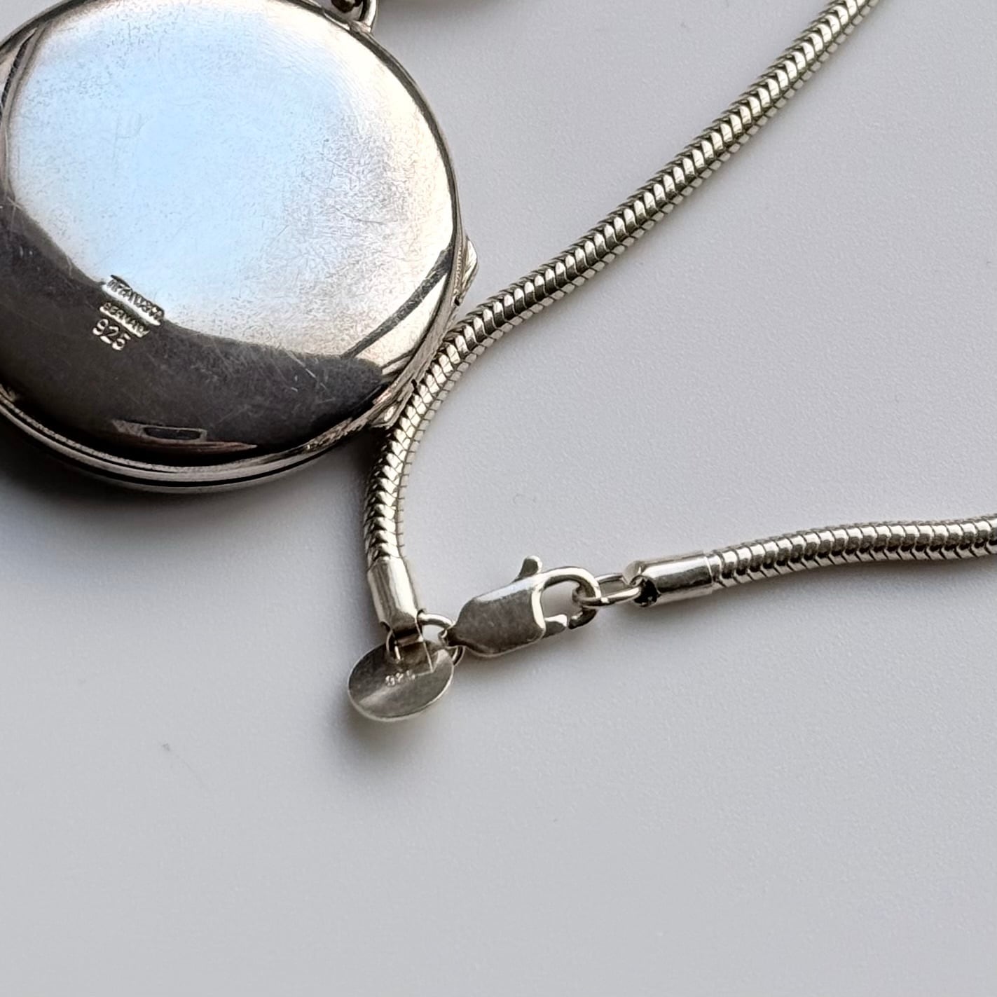 大切な写真やメッセージなどを入れ持ち運ぶ、または身につけるロケットペンダント。ティファニー社製の銀製品ではロングセラー商品になります。その中でもこちらはドイツ製は希少でオリジナルのスネークチェーンになります。